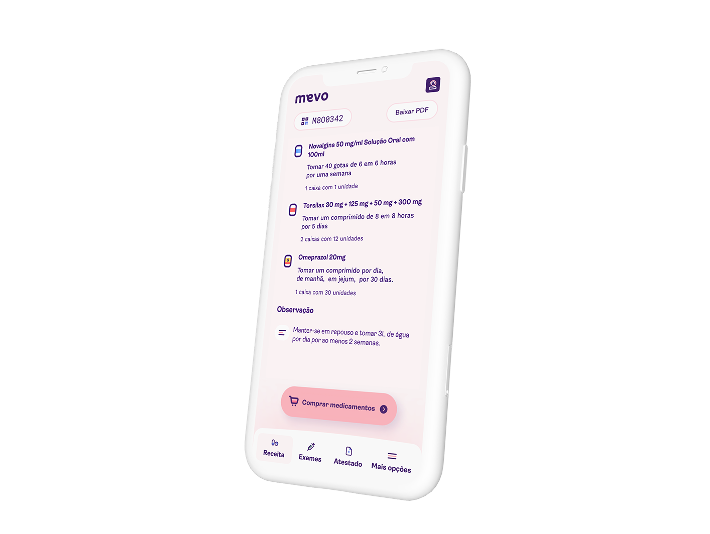 Na hora de prescrever a receita com medicamentos, o/a profissional utiliza nosso sistema Mevo Receita Digital, ganhando muito mais praticidade e segurança.