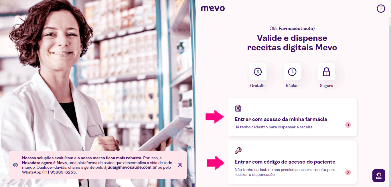1º Acesse o Portal de Dispensação Mevo e escolha a opção de acesso à plataforma que se encaixe a sua situação: