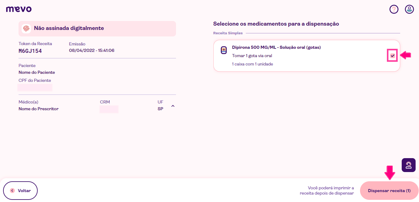 3º Selecione apenas o medicamento que deseja dispensar e clique em "Dispensar receita".