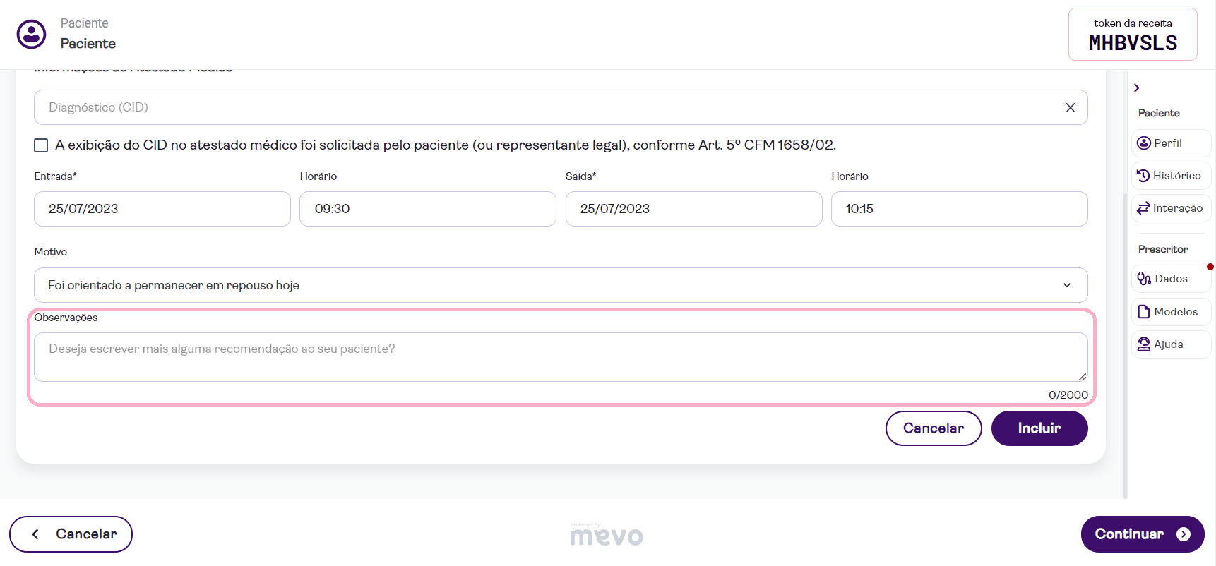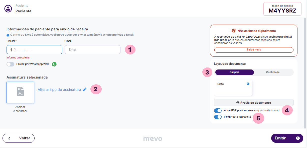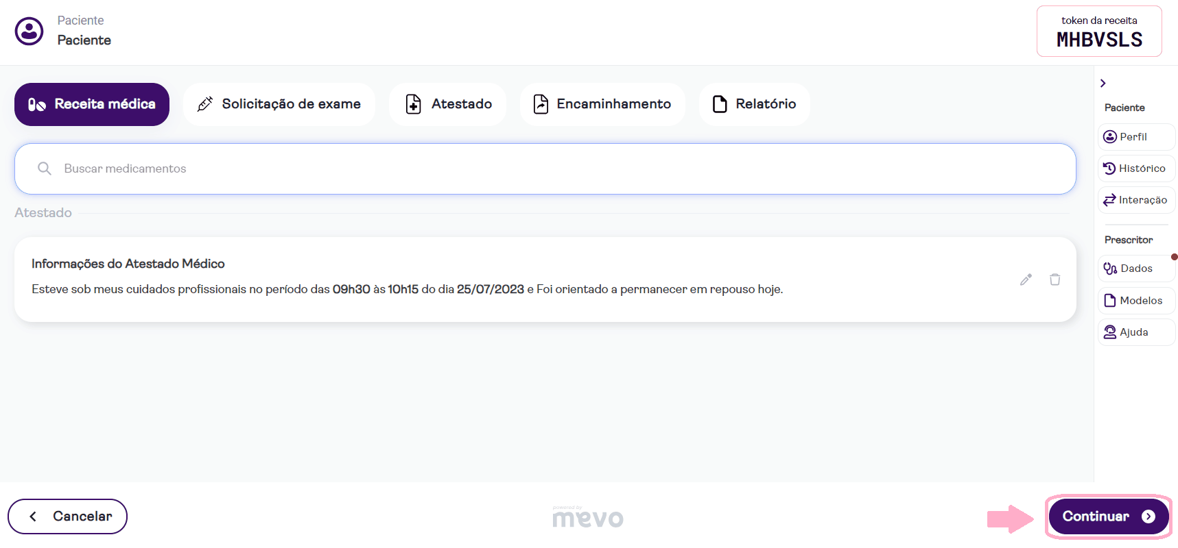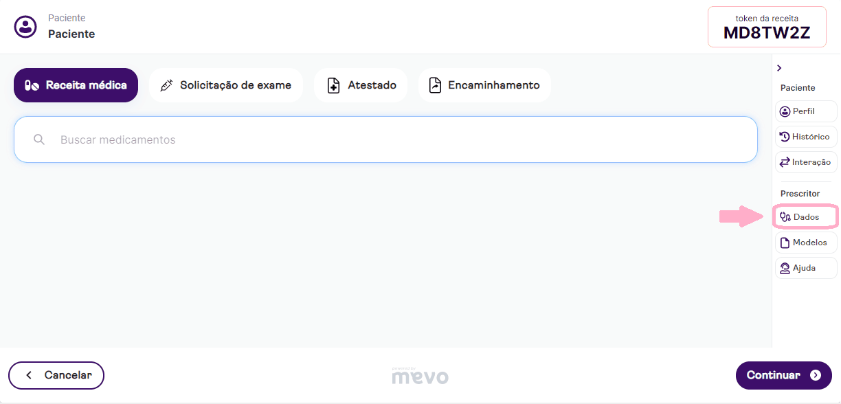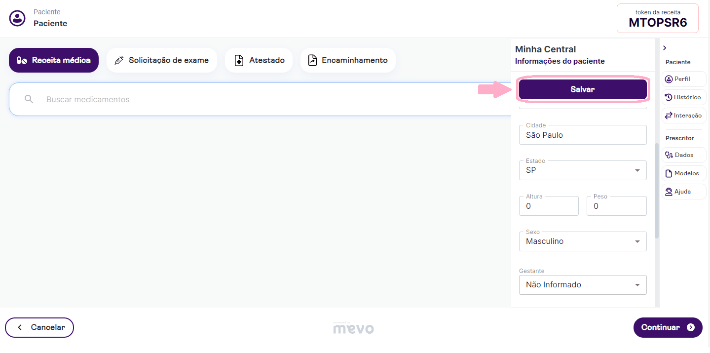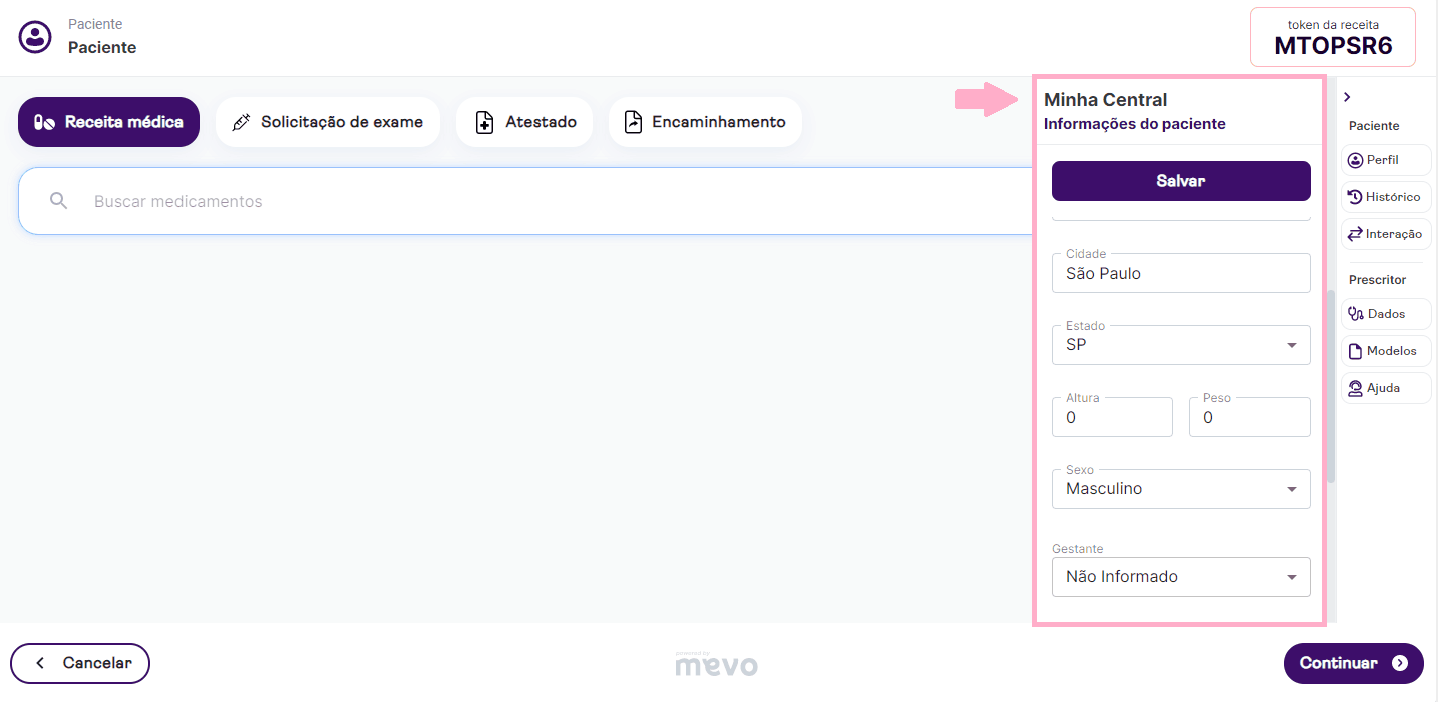 Todas essas informações precisam estar completas e atualizadas no sistema que você utiliza (Sistema de Prontuário e/ou Telemedicina), pois elas serão encaminhadas automaticamente para a Mevo Receita Digital.