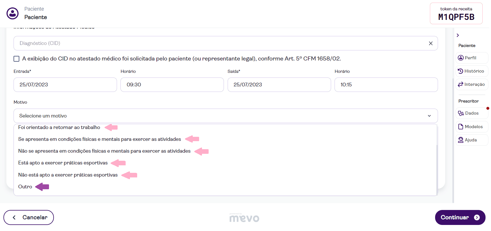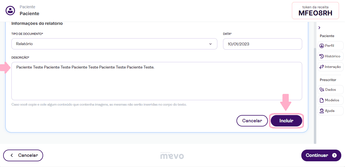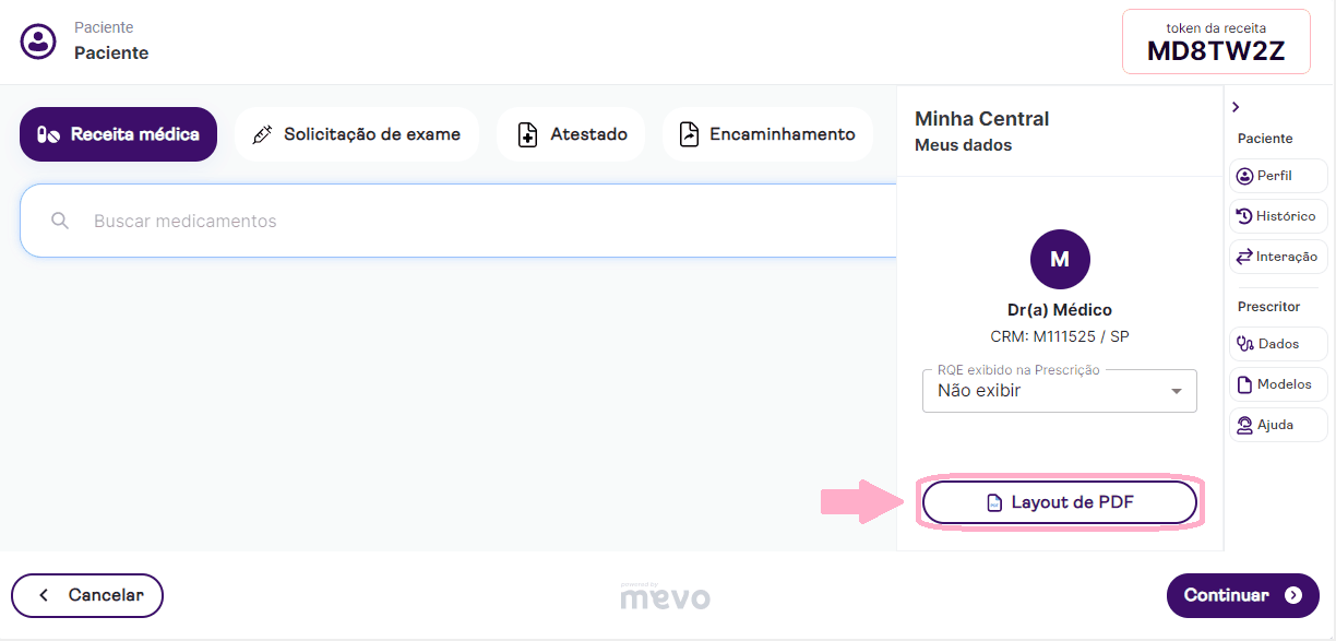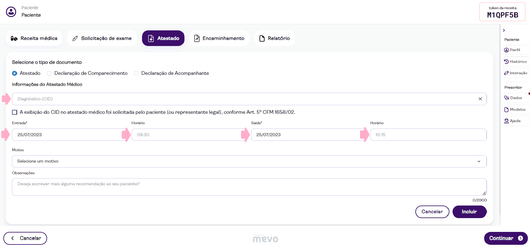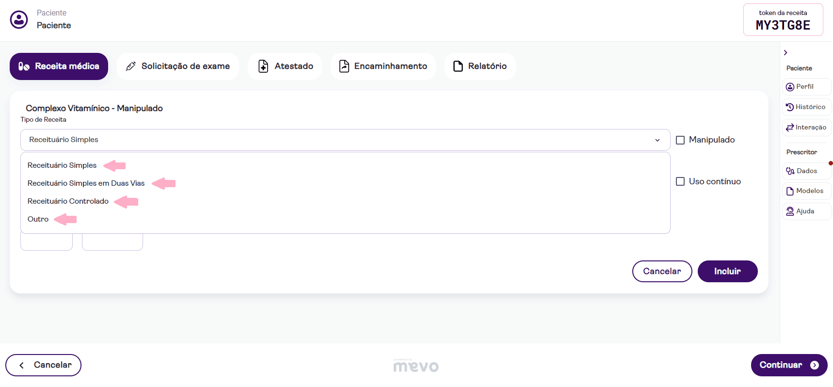 Todas essas informações precisam estar completas e atualizadas no sistema que você utiliza (Sistema de Prontuário e/ou Telemedicina), pois elas serão encaminhadas automaticamente para a Mevo Receita Digital.