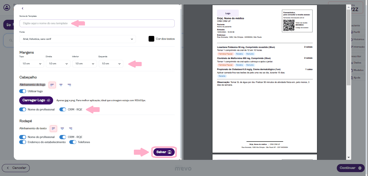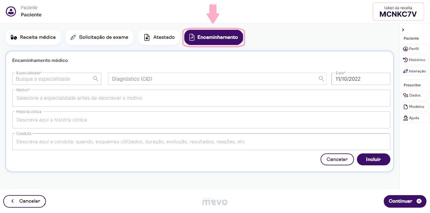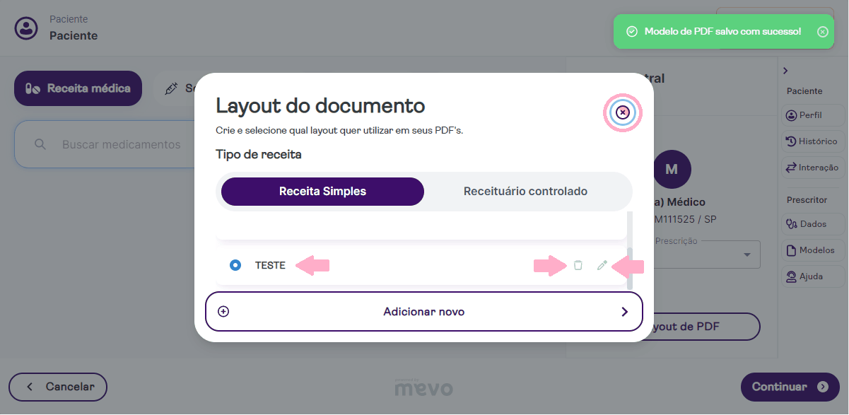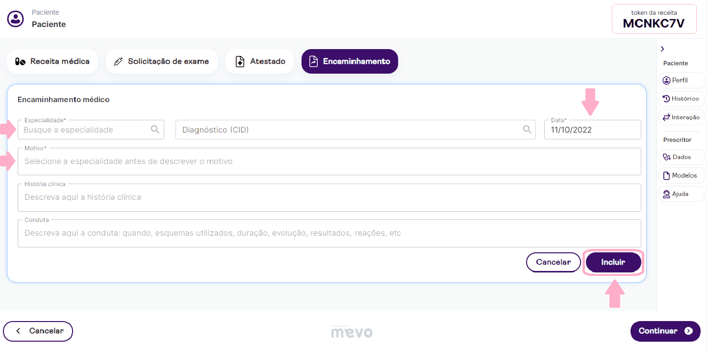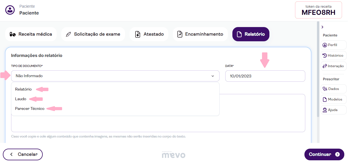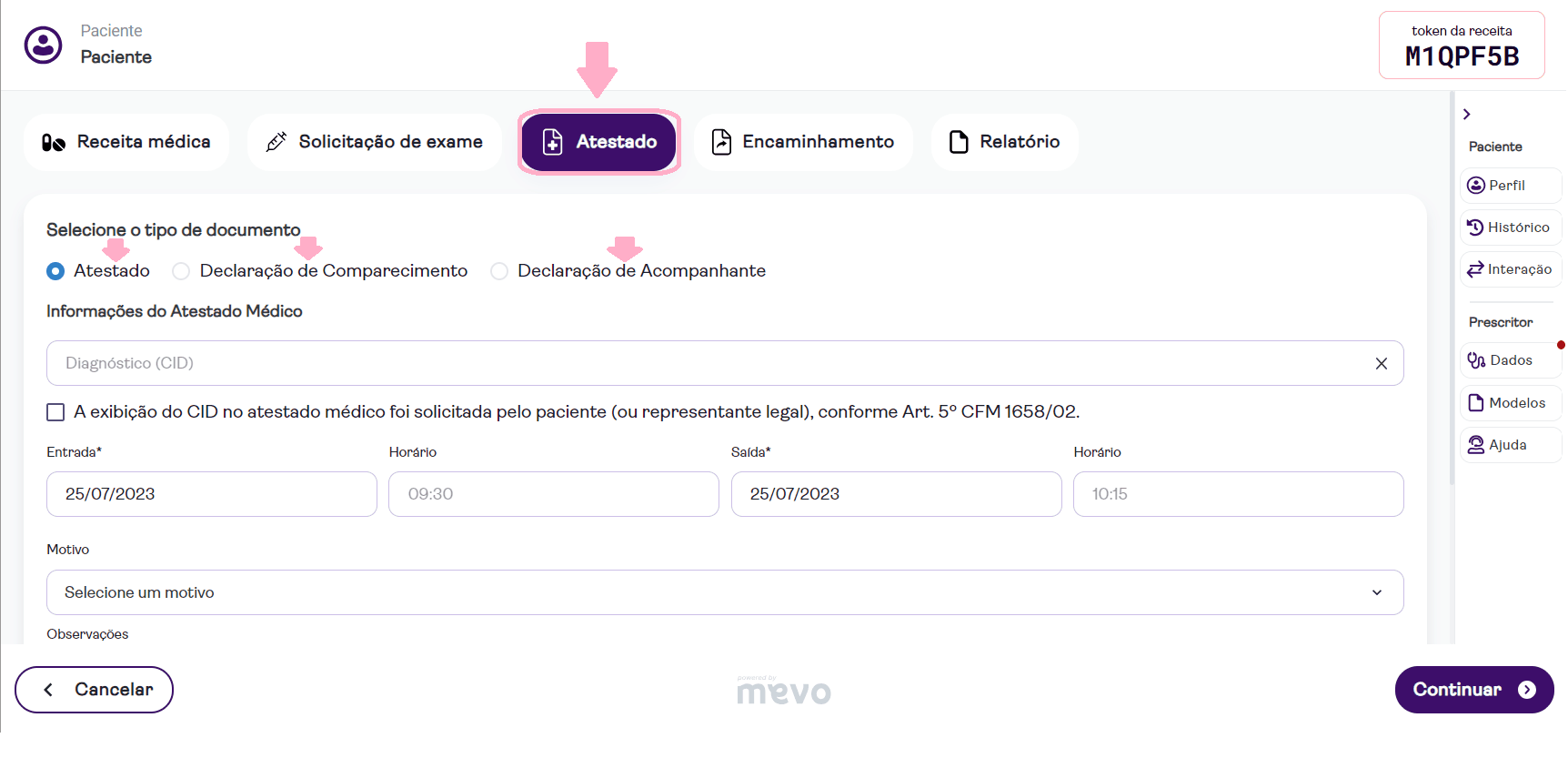 Todas essas informações precisam estar completas e atualizadas no sistema que você utiliza (Sistema de Prontuário e/ou Telemedicina), pois elas serão encaminhadas automaticamente para a Mevo Receita Digital.