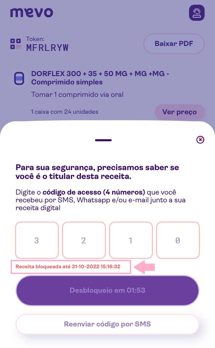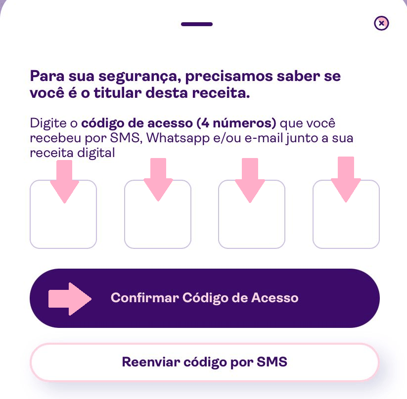 2º Solicite ao paciente token de sua receita (inicia com NX ou M) e o código de acesso (de 4 dígitos) recebidos por ele por SMS, Whatsapp e/ou e-mail.