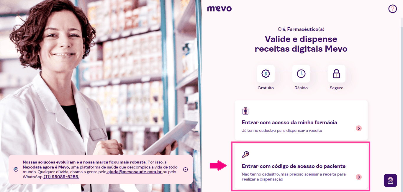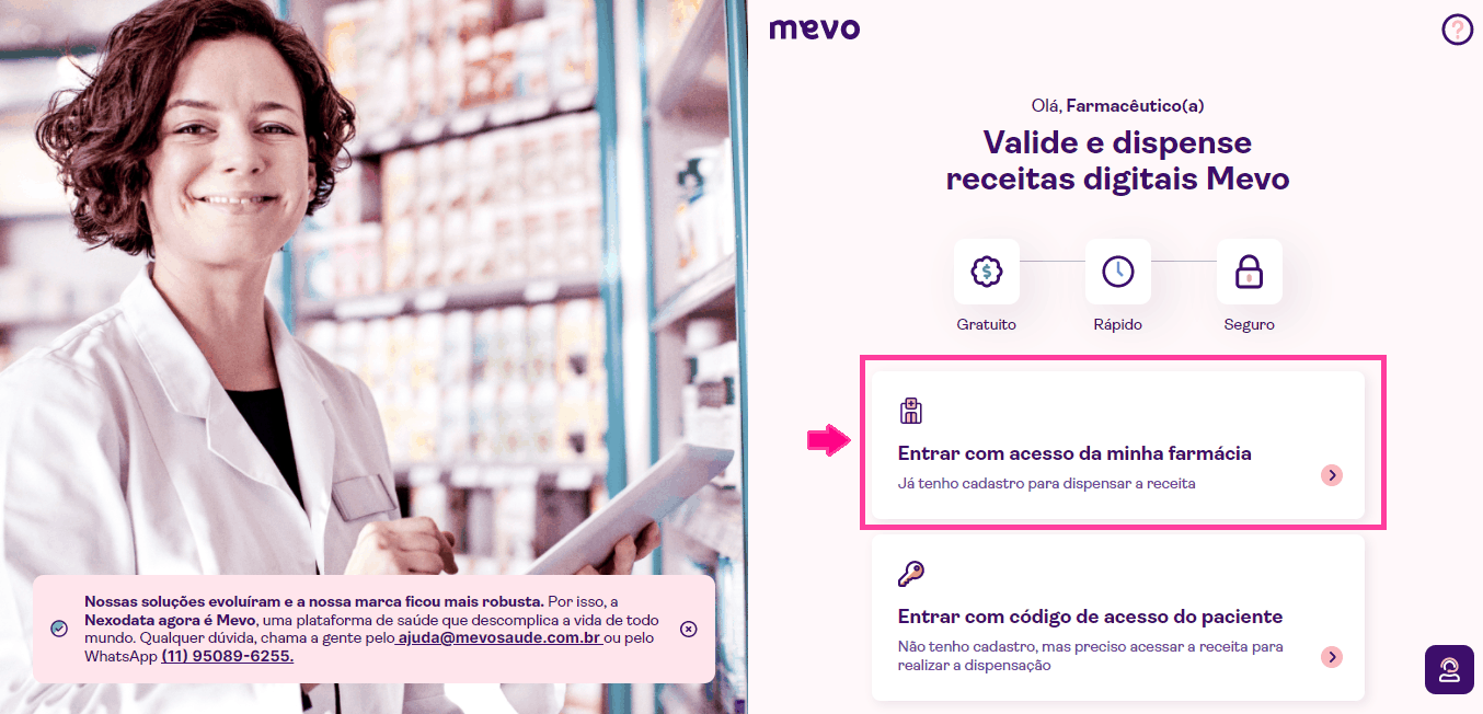 1º Acesse o Portal de Dispensação Mevo e clique em "Entrar com acesso da minha farmácia".