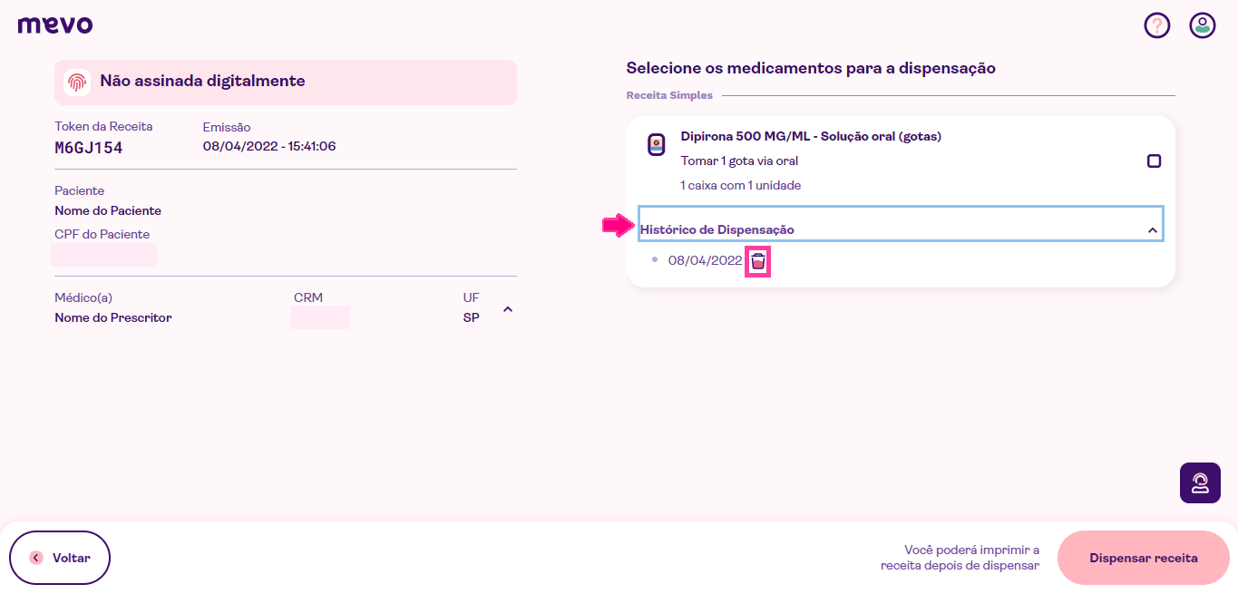 Agora, se você realizar a dispensação pelo outro fluxo, pelo 'Código de acesso do paciente' (para farmácias sem cadastro), não será possível cancelar a dispensação.