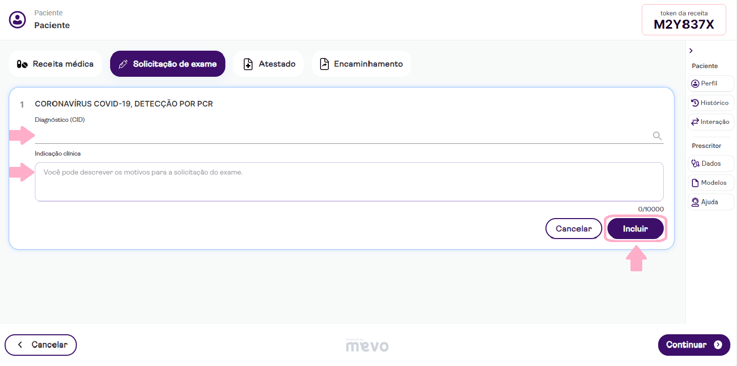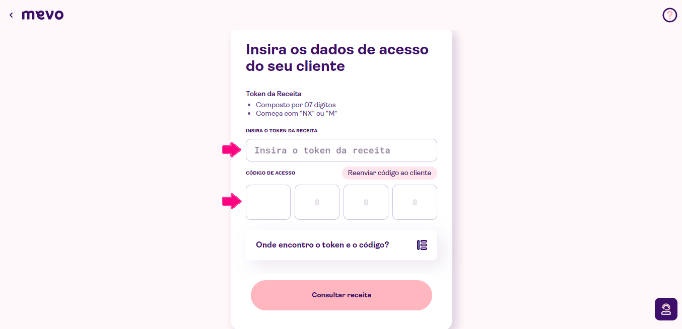2º Insira o token da receita, que inicia com M ou NX e o código de acesso de 4 dígitos.