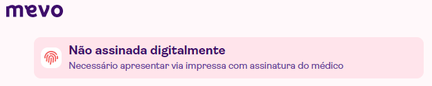 Ah, atenção: Observe se a receita digital está sinalizada como "assinada digitalmente". Esse ícone comprova se a receita possui ou não assinatura digital do médico. Em casos de receitas "não assinada digitalmente", a receita não possui assinatura válida e tem função apenas de consulta.