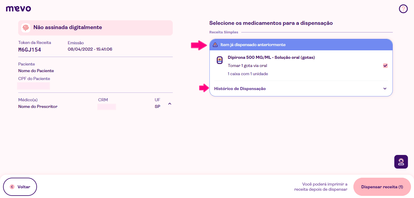 Ah, importante: a Mevo não bloqueia a dispensação de receitas já dispensadas, porém comunica o farmacêutico que houve a dispensação para que ele não realize a dupla dispensação.